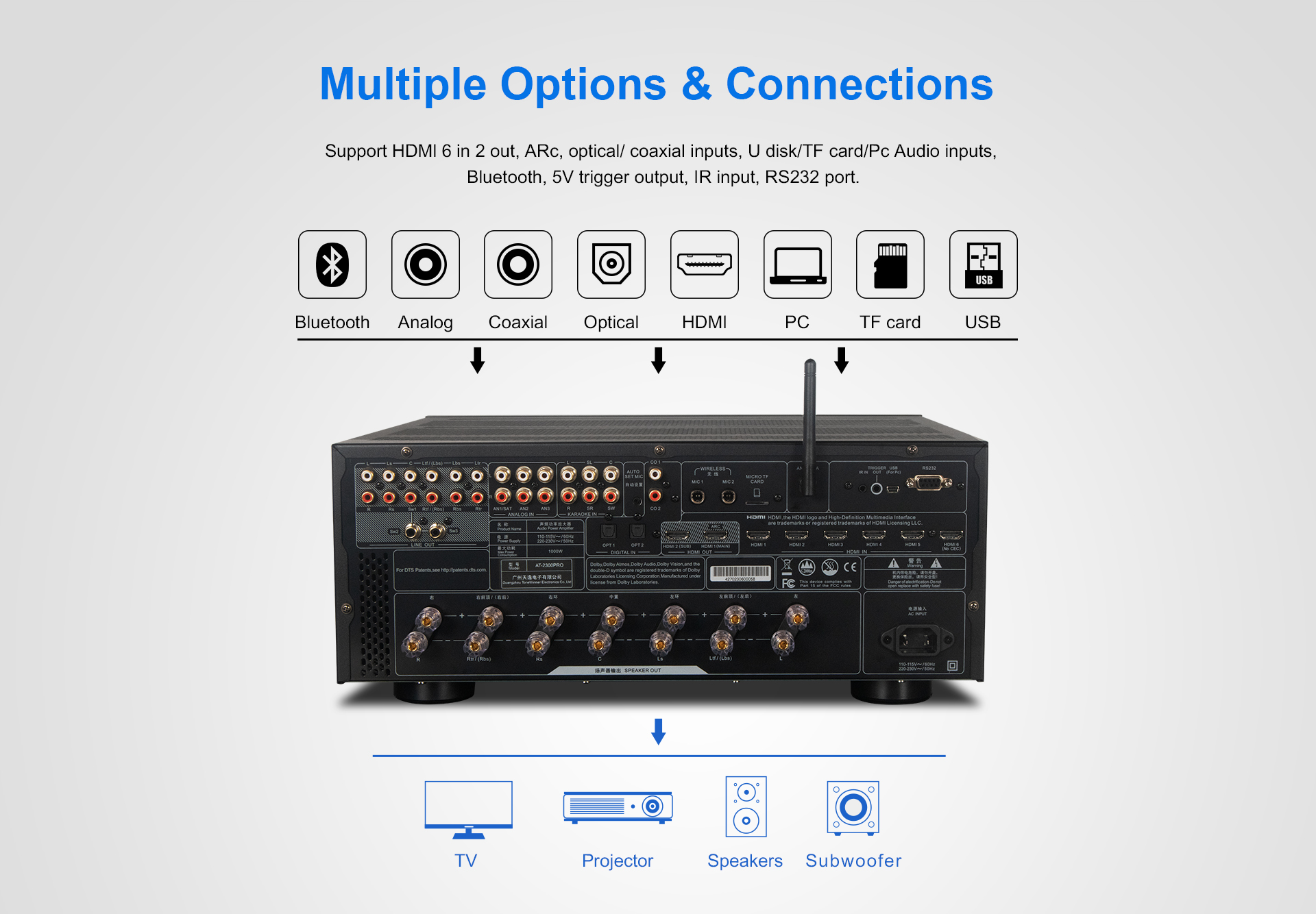 AT-2300PRO to Amplituner AV Dolby Atmos/DTS:X 7.1 , który charakteryzuje się inteligentnym, dynamicznym zarządzaniem energią i obwodami klasy H, zapewniając precyzyjną alokację mocy w czasie rzeczywistym w scenariuszach wielokanałowych.