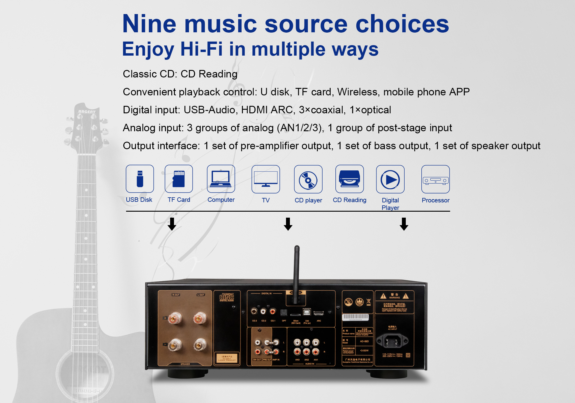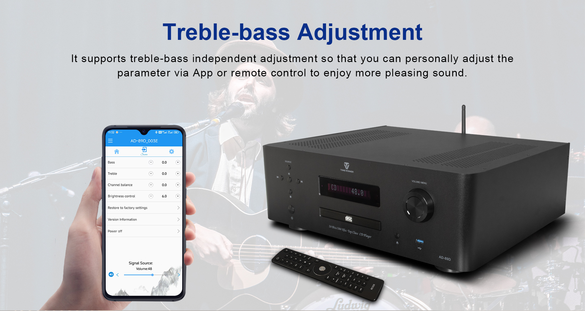 AD-89D to zintegrowany wzmacniacz Hi-Fi, zaprojektowany w oparciu o 30-letnie doświadczenie techniczne firmy Tonewinner, aby sprostać zapotrzebowaniu rynku na urządzenia wielofunkcyjne. Produkt ten łączy w sobie funkcje takie jak odtwarzacz CD, odtwarzacz multimediów strumieniowych, dekoder przedwzmacniacza i wzmacniacz. Układ jest dopracowany i stabilny, a materiały solidne i wysokiej jakości, co czyni go niezawodnym i trwałym. Dźwięk jest okrągły i delikatny, a stosunek ceny do jakości niezwykle wysoki. To reprezentatywne arcydzieło nowej generacji cyfrowych wzmacniaczy Hi-Fi.