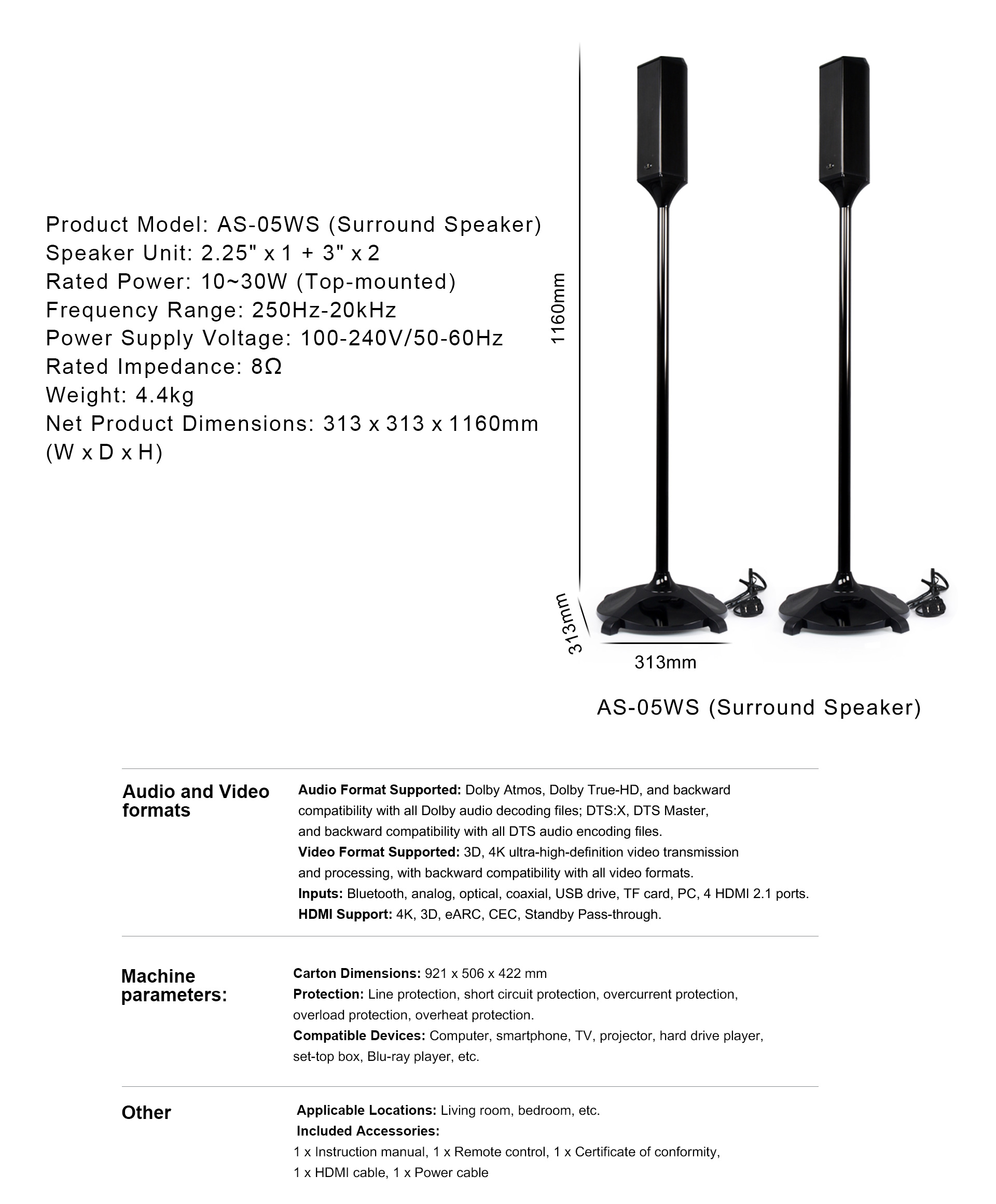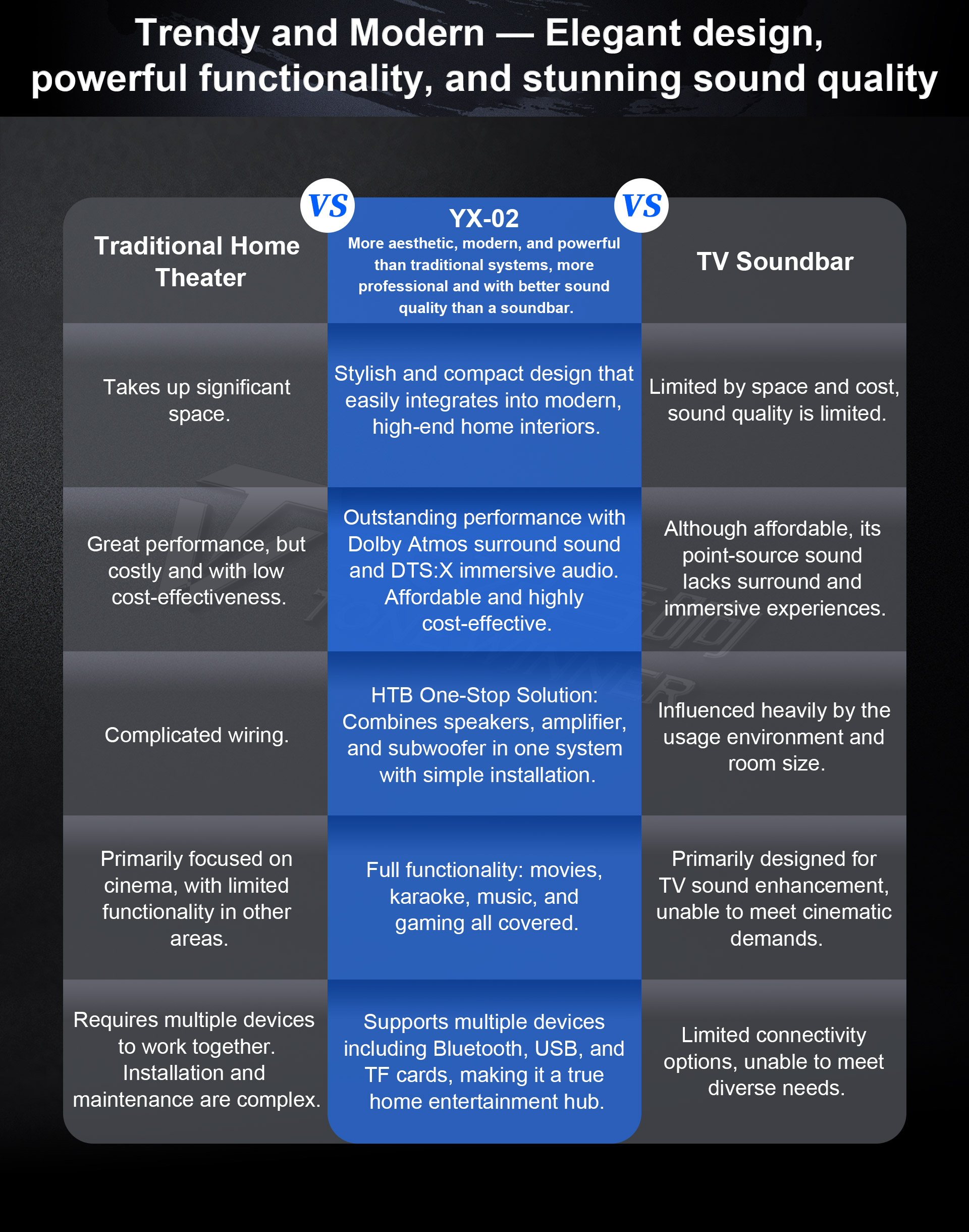 Tonewinner YX-02P to kompleksowy system kina domowego, który łączy w sobie dźwięk przestrzenny Dolby Atmos, profesjonalne wrażenia z KTV, muzykę Hi-Fi i gry. Wyposażony jest w układ głośników 5.1.4, obsługujący zarówno formaty dźwięku immersyjnego Dolby Atmos, jak i DTS:X. Dodatkowo, obsługuje wideo 4K, zapewniając niezrównane wrażenia immersyjne. System oferuje profesjonalny dźwięk przestrzenny 5.1.4 do karaoke, sterowanie za pomocą aplikacji na smartfony, kompatybilność z kartami USB/TF, bezstratną transmisję Bluetooth oraz zwrot dźwięku eARC.