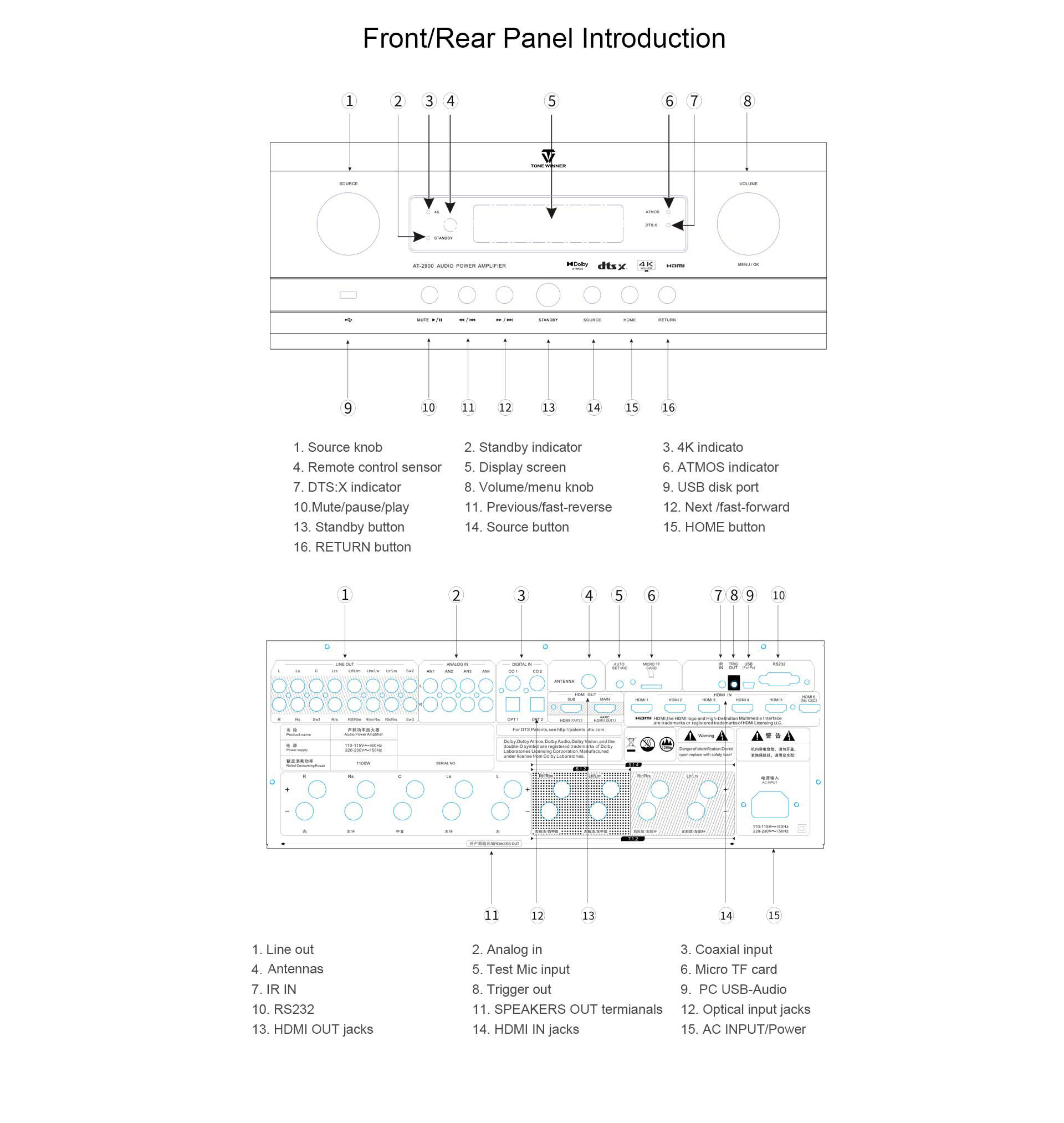 AT-2900 to zintegrowany wzmacniacz AV obsługujący formaty Dolby Atmos, DTS:X, Dolby Vision, HDR, 4K i wszystkie ich niższe wersje. AT-2900 AVR obsługuje niezależne dekodowanie 14 kanałów z 3 wyjściami subwoofera, co pozwala na konfigurację głośników w układzie 7.3.6 lub 9.3.4. Zapewnia niezależną regulację głośności dla każdego kanału, w tym subwoofera. Obsługuje również 6 wejść i 2 wyjścia HDMI, eARC, kartę TF, dysk USB, menu OSD, RS232, sterowanie za pomocą aplikacji, automatyczną kalibrację pomieszczenia testowego itp. To wielofunkcyjny zintegrowany wzmacniacz AV do domowej rozrywki wysokiej klasy.