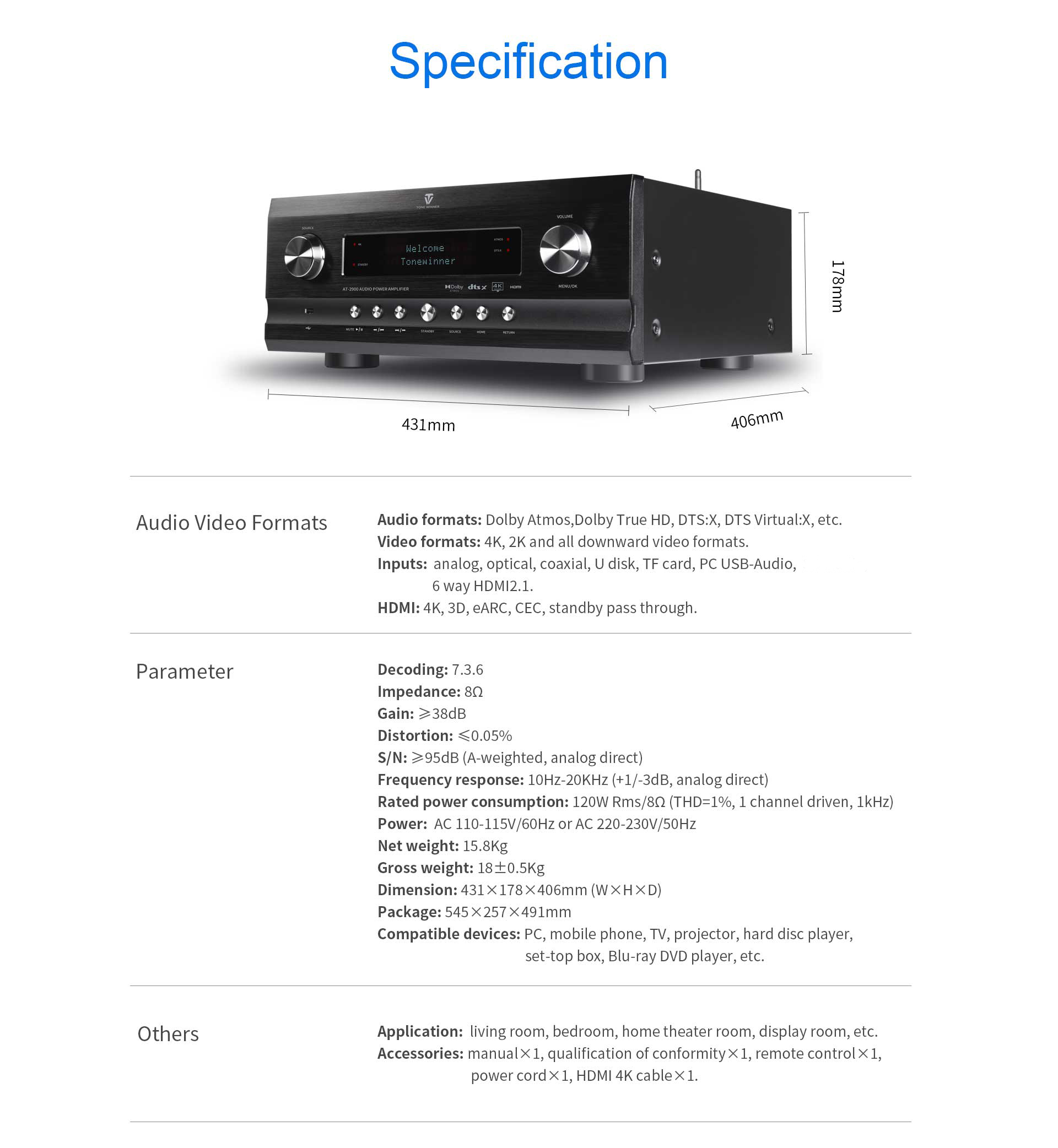 Oprogramowanie sprzętowe i oprogramowanie są projektowane i tworzone przez projektantów Tonewinner z wykorzystaniem oryginalnego kodu źródłowego i patentów, a wszystkie produkty są wytwarzane zgodnie z jednym standardem i podlegają ścisłej kontroli. Dzięki zasilaniu prądem zmiennym od 110 V do 230 V, ten amplituner AV oferuje światu przyjemną rozrywkę audio-wideo.