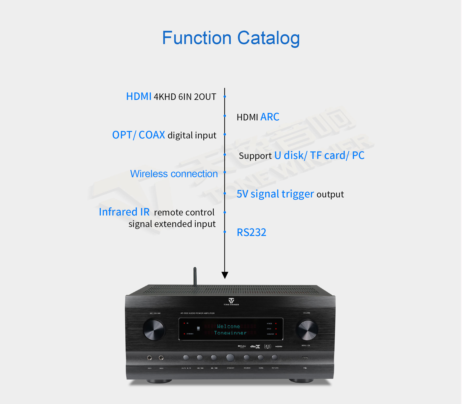 AT-2000 to wzmacniacz mocy typu „wszystko w jednym” dźwięk przestrzenny kino domowe karaoke wzmacniacz zintegrowany amplituner AV Obsługuje efekty dźwiękowe Dolby Atmos i DTS:X oraz technologię wideo 4K. Jest kompatybilny z formatami 3D, HDR, Dolby Vision i innymi formatami wideo. Obsługuje również dyski USB i karty TF. 11-kanałowy amplituner AV Obsługuje wiele formatów audio bezstratnych i o wysokiej kompresji. Obsługuje również sterowanie za pomocą aplikacji mobilnych, bezprzewodową transmisję bezstratną i ARC. Jest to wzmacniacz audio i wideo wysokiej klasy które mogą w pełni zaspokoić potrzeby domowej rozrywki.