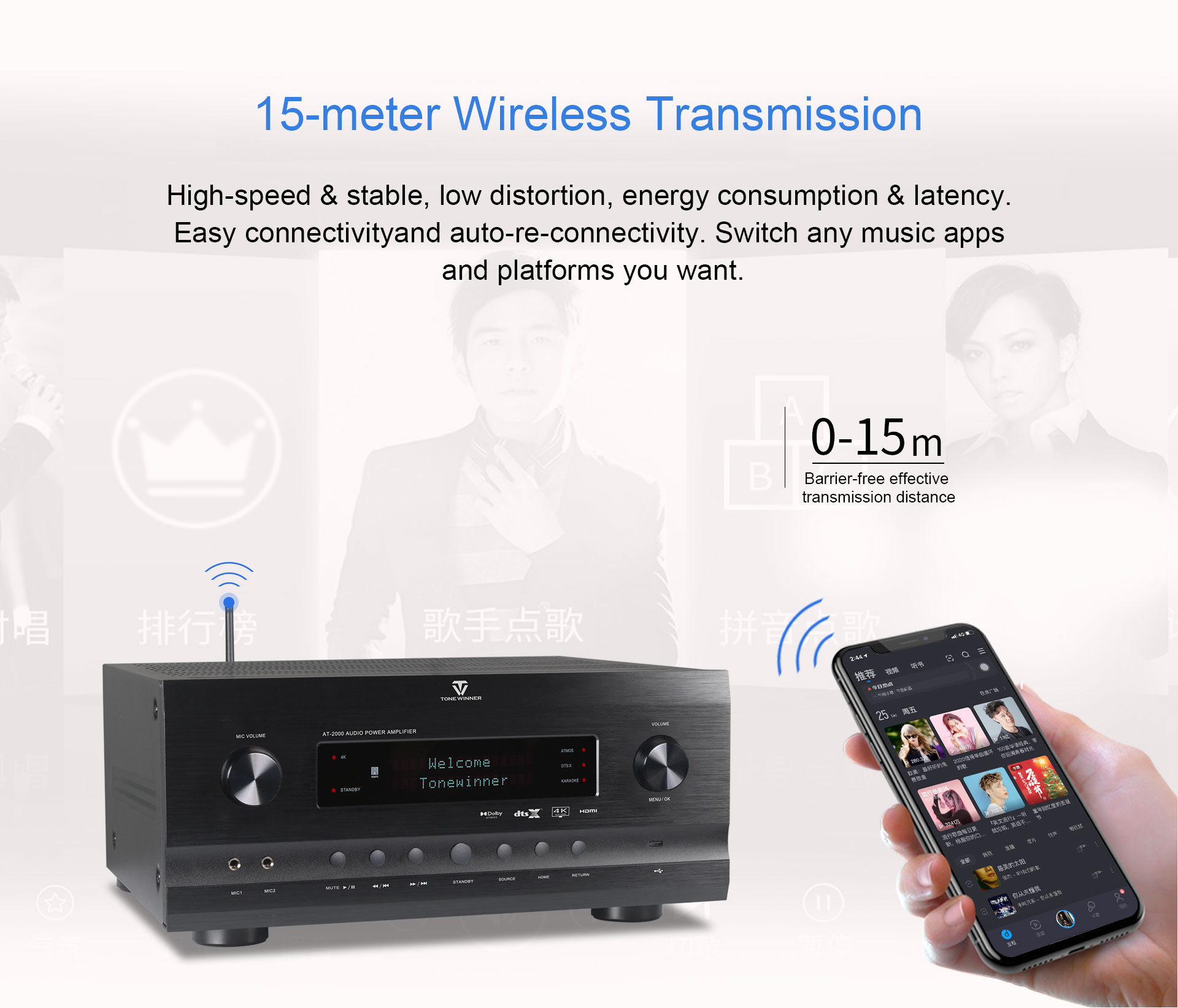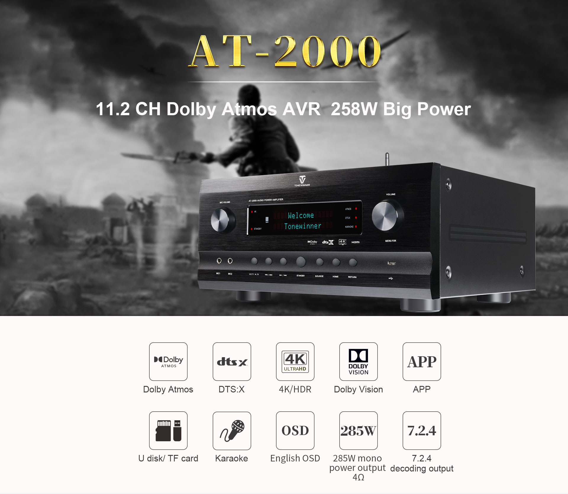 AT-2000 to wysokiej klasy zintegrowany wzmacniacz kina domowego i karaoke. Obsługuje Dolby Atmos i DTS:X i jest wstecznie kompatybilny ze wszystkimi poprzednimi wersjami tych formatów dźwięku. Obsługuje 4K, 3D, HDR, Dolby Vision, odtwarzanie dźwięku ARC, sterowanie mikrofonem za pomocą aplikacji, dysk USB, kartę TF, a także kilka bezstratnych i skompresowanych formatów audio. Można go skonfigurować jako system 7.2.4, co zapewnia wciągające wrażenia karaoke.