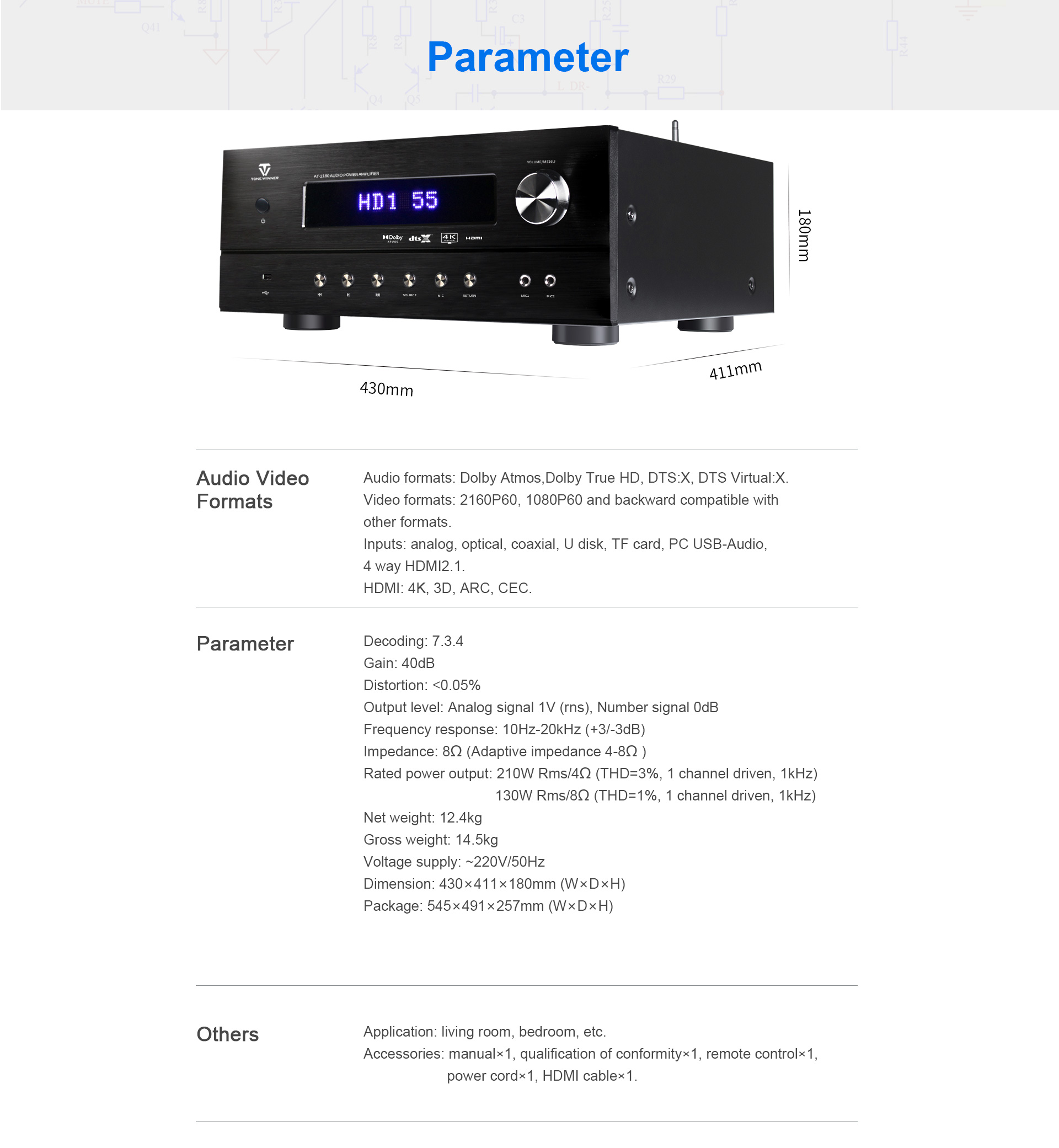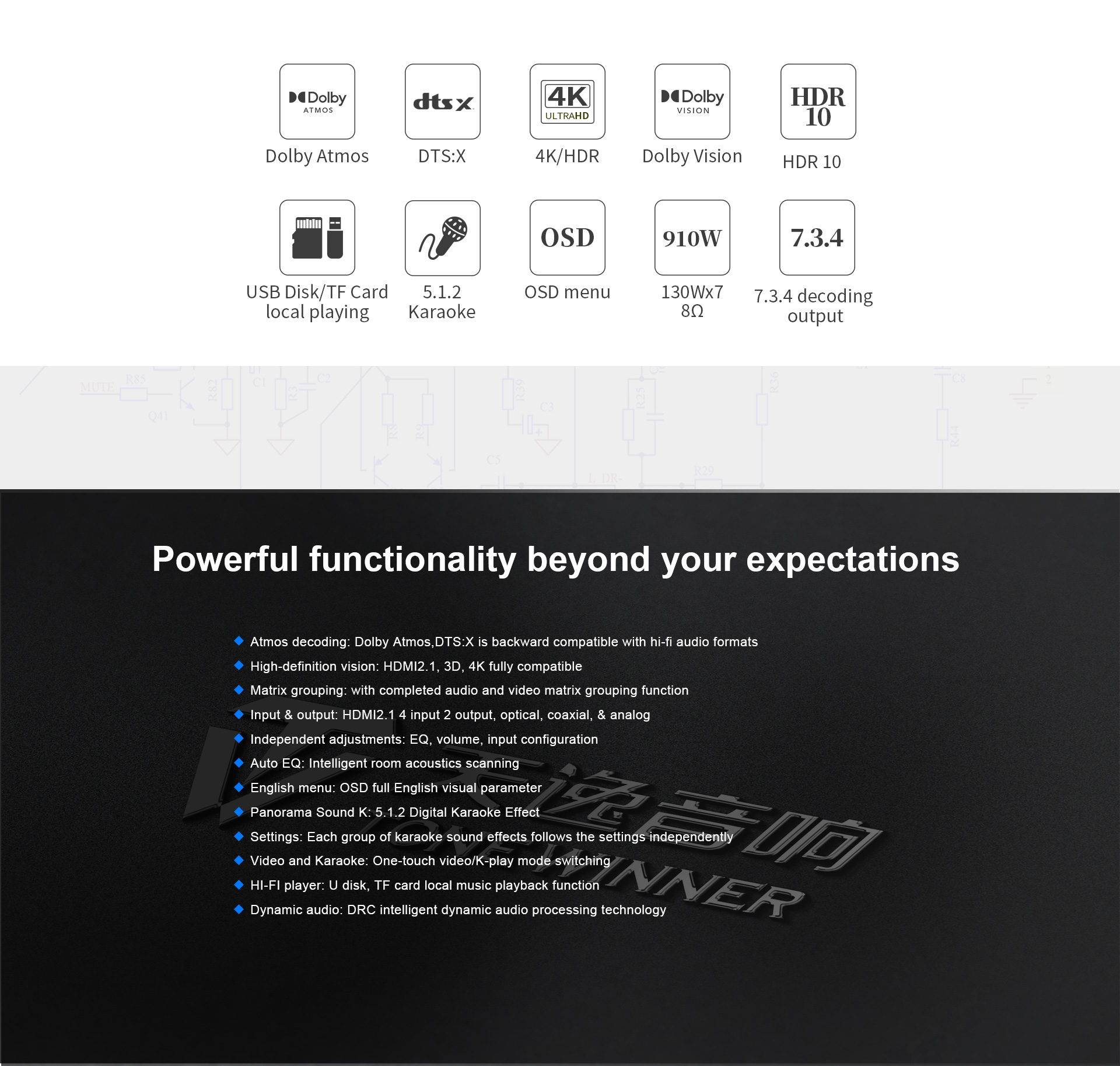 Razem dokonują one regulacji efektów dźwiękowych, dostosowują krzywą odpowiedzi częstotliwościowej głośnika i korygują barwę dźwięku, aby zapewnić separację pola dźwiękowego i ciągłość dźwięku przestrzennego. Odbiornik
