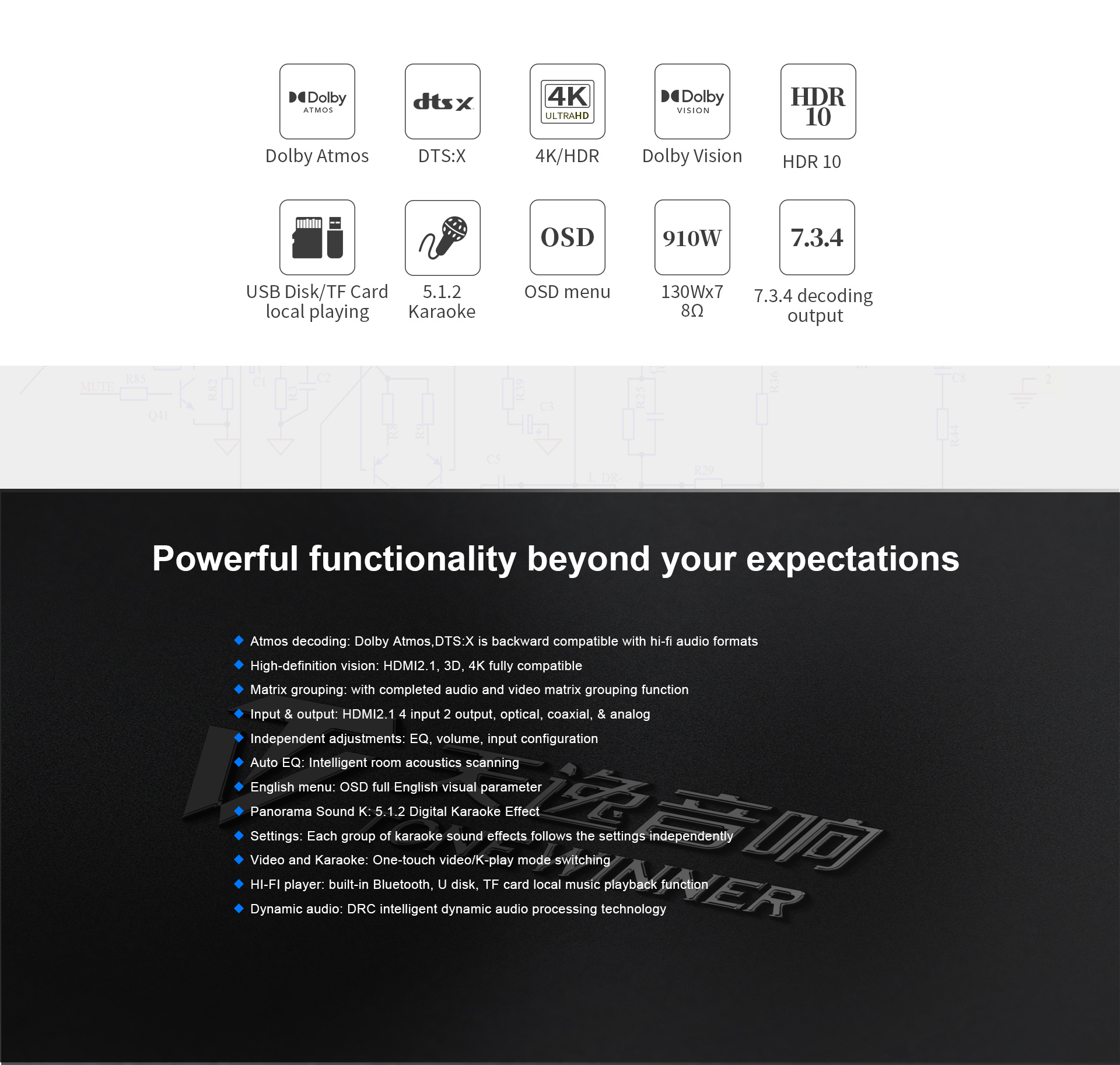 7.3.4-kanałowe (łącznie 14 kanałów) wyjście liniowe dekodujące dźwięk Atoms pozwala mu działać niezależnie jako dekoder przedwzmacniacza. Można go podłączyć do dedykowanych wzmacniaczy mocy i 3 subwooferów, co pozwala na stworzenie bardziej immersyjnego systemu audio.