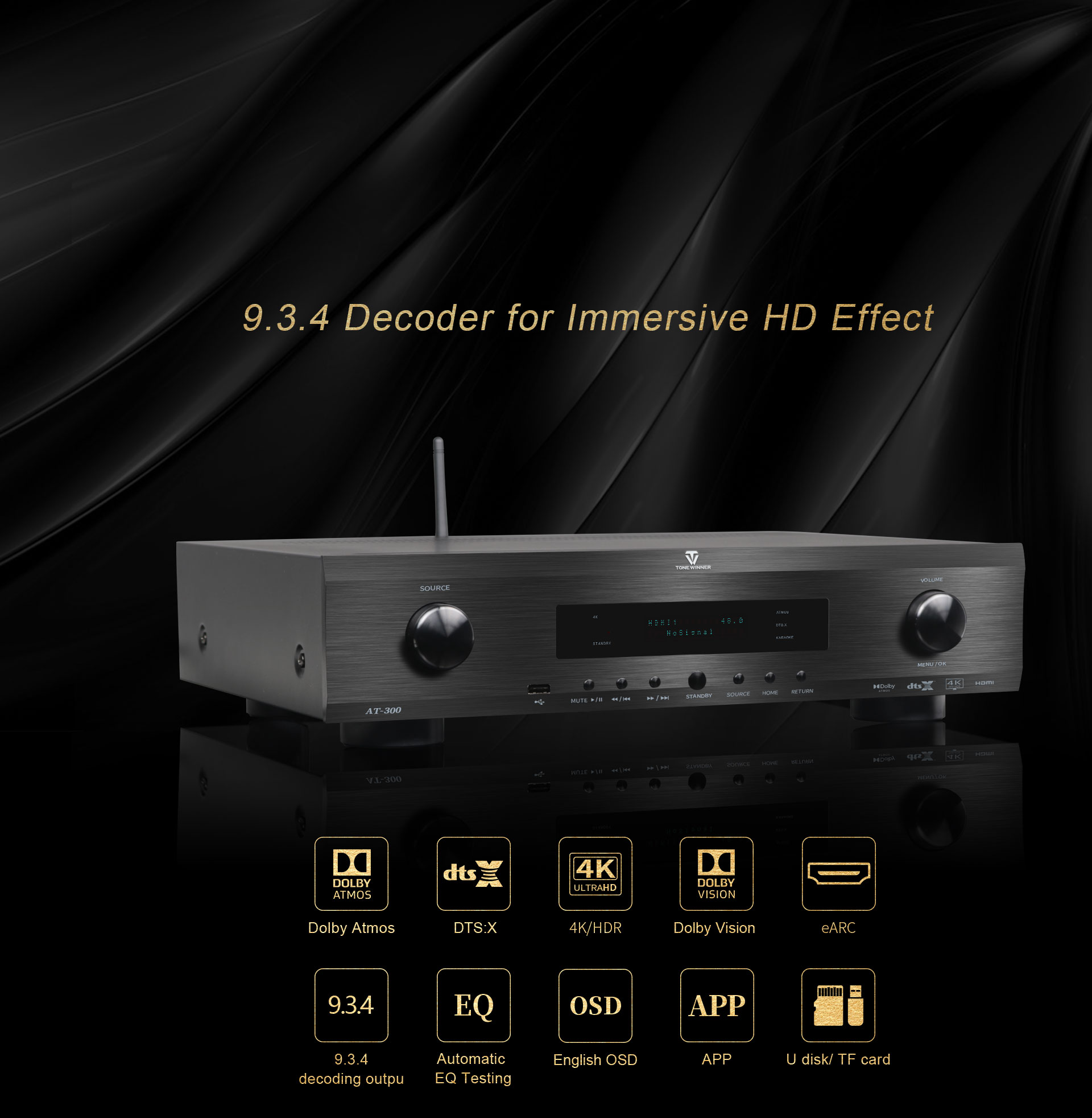 AT-300 to profesjonalny, zintegrowany dekoder audio-wideo dla kina domowego i centrum muzycznego, przeznaczony do konfiguracji 9.3.4. Firma dTonewinner posiada ponad 30-letnie doświadczenie w projektowaniu i produkcji, a jego projekt przejęli inżynierowie uznani przez amerykańską firmę THX. Urządzenie obsługuje dekodowanie 4K i posiada certyfikaty Dolby Atmos, DTS:X i HDMI 2.0.