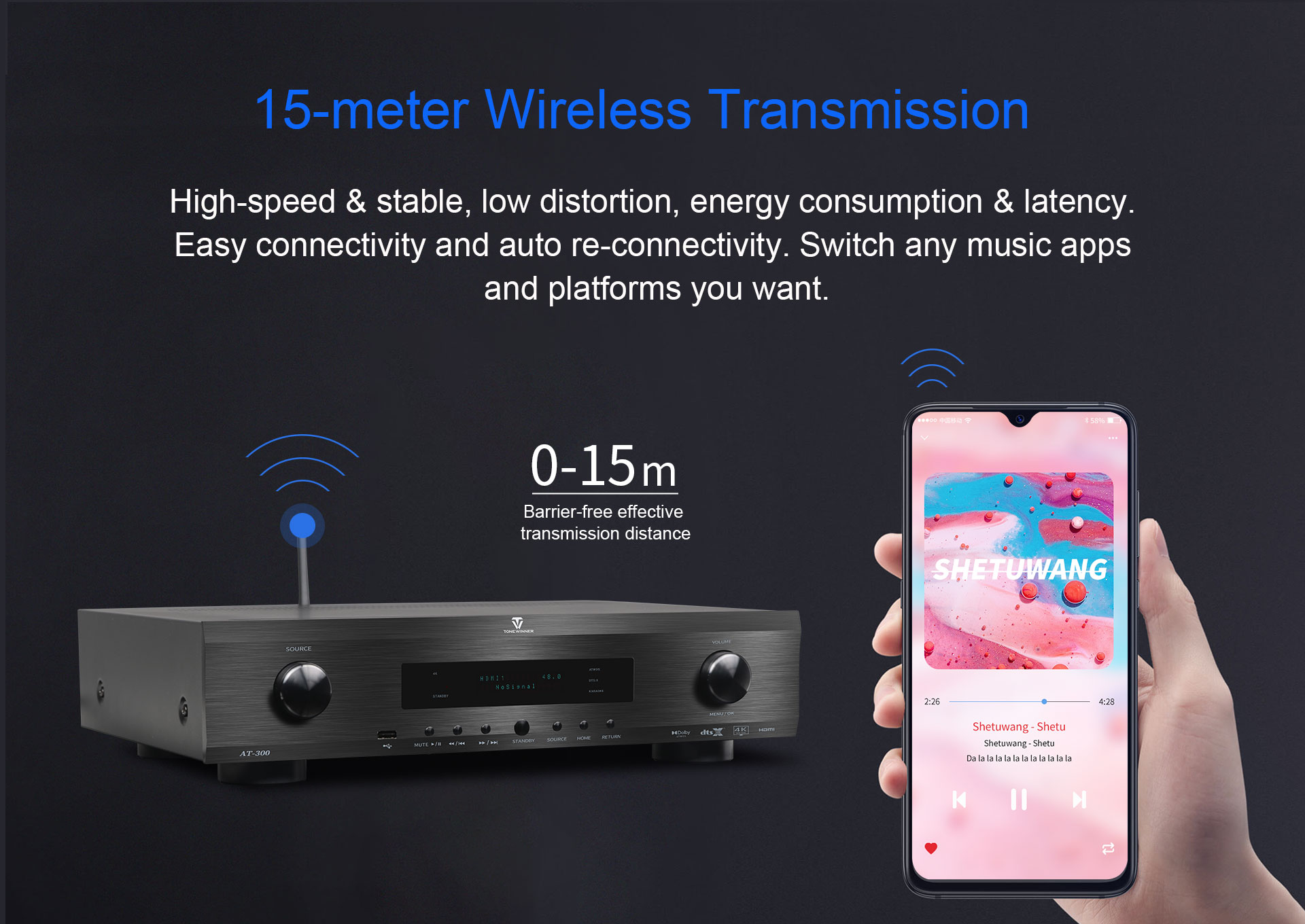 Obsługa dysków USB 128 GB, kart TF i formatów APE, FLAC, WAV, MP3, WMA.