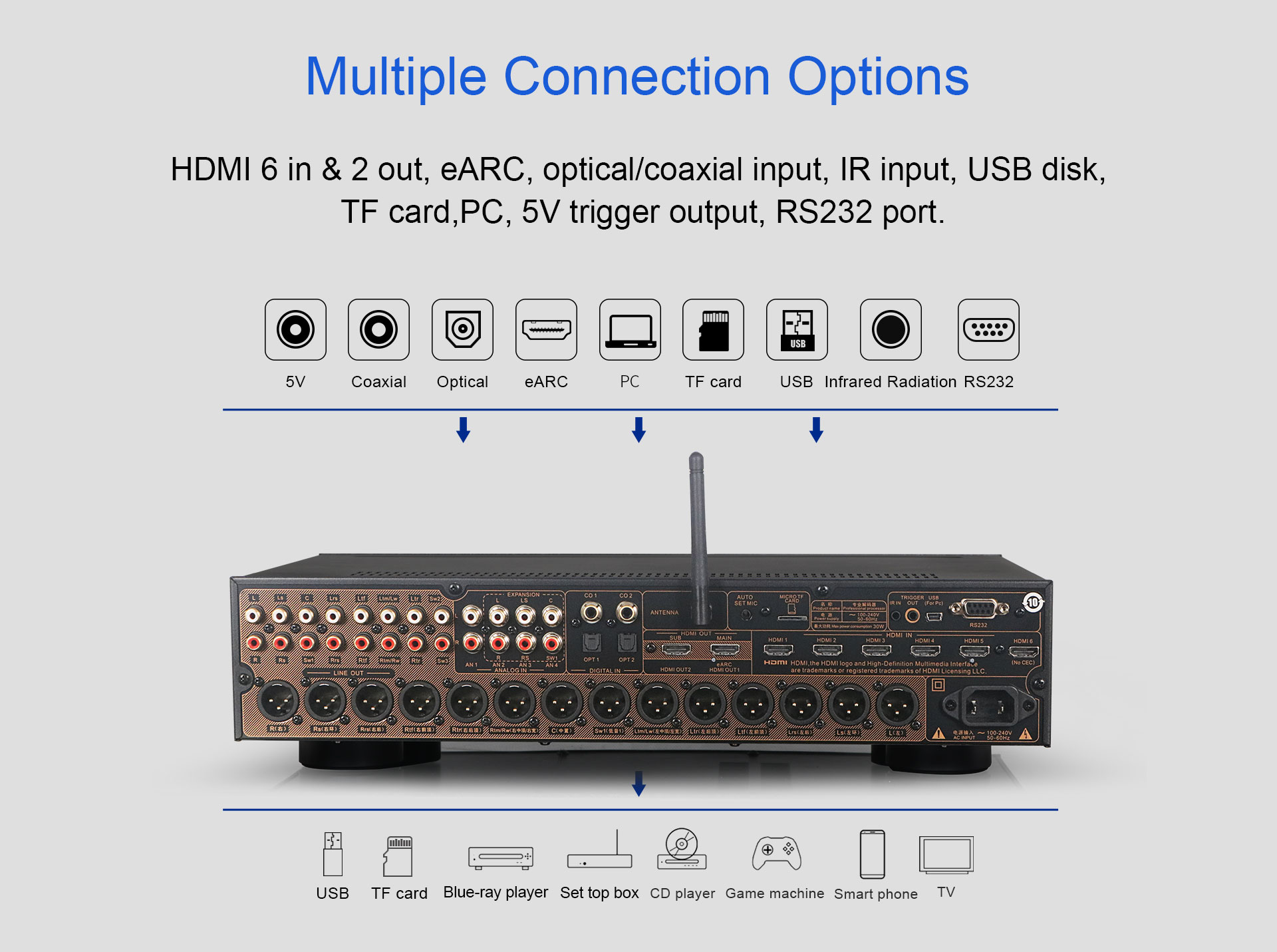 AT-300 to Dekoder AV kina domowego na 16 kanałów . Ten profesjonalny procesor Obsługuje 4K i posiada certyfikaty Dolby Atmos, DTS:X i HDMI 2.0. Jako wielofunkcyjny dekoder , ten przedwzmacniacz można stosować w domach, kinach i teatrach, aby uzyskać wciągający dźwięk 3D Hi-Fi.