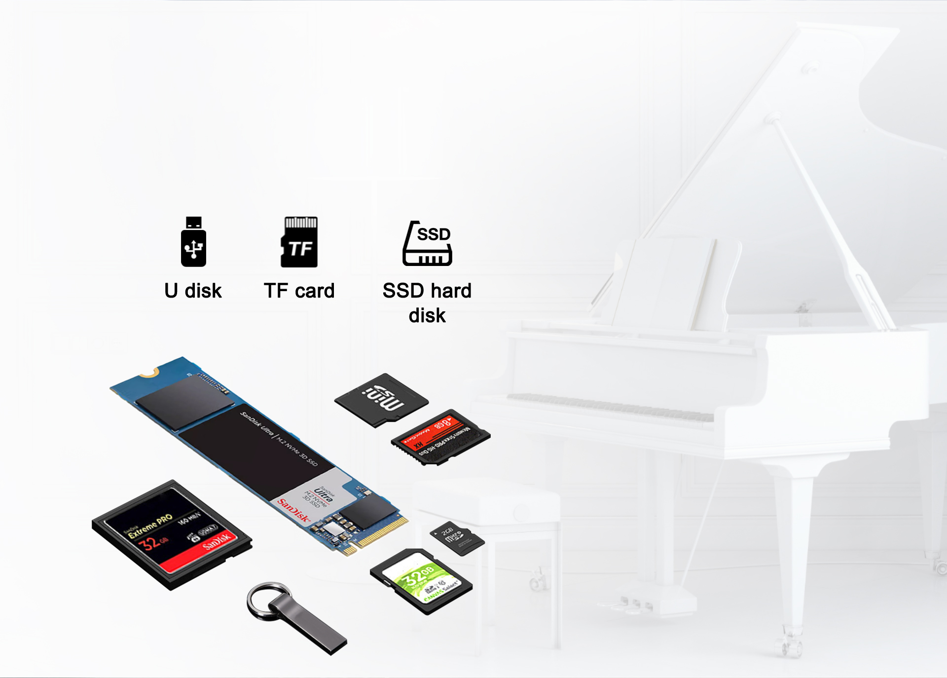 Wejścia do odtwarzania lokalnego: dysk twardy SSD M.2, 2 porty USB 3.0 (rozszerzalny OTG), 1 karta Micro SD.