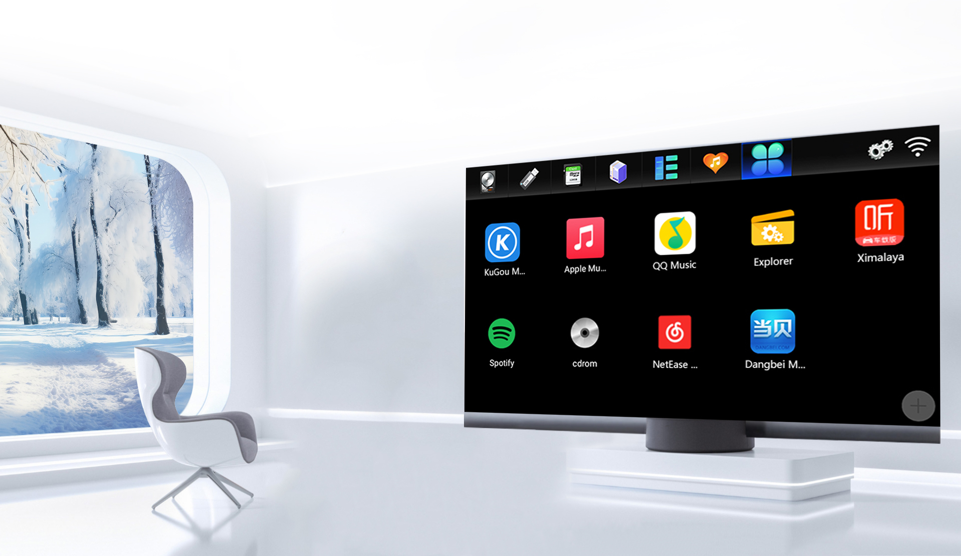 Unikalny interfejs do zarządzania centrum odtwarzania muzyki i menu telewizora,