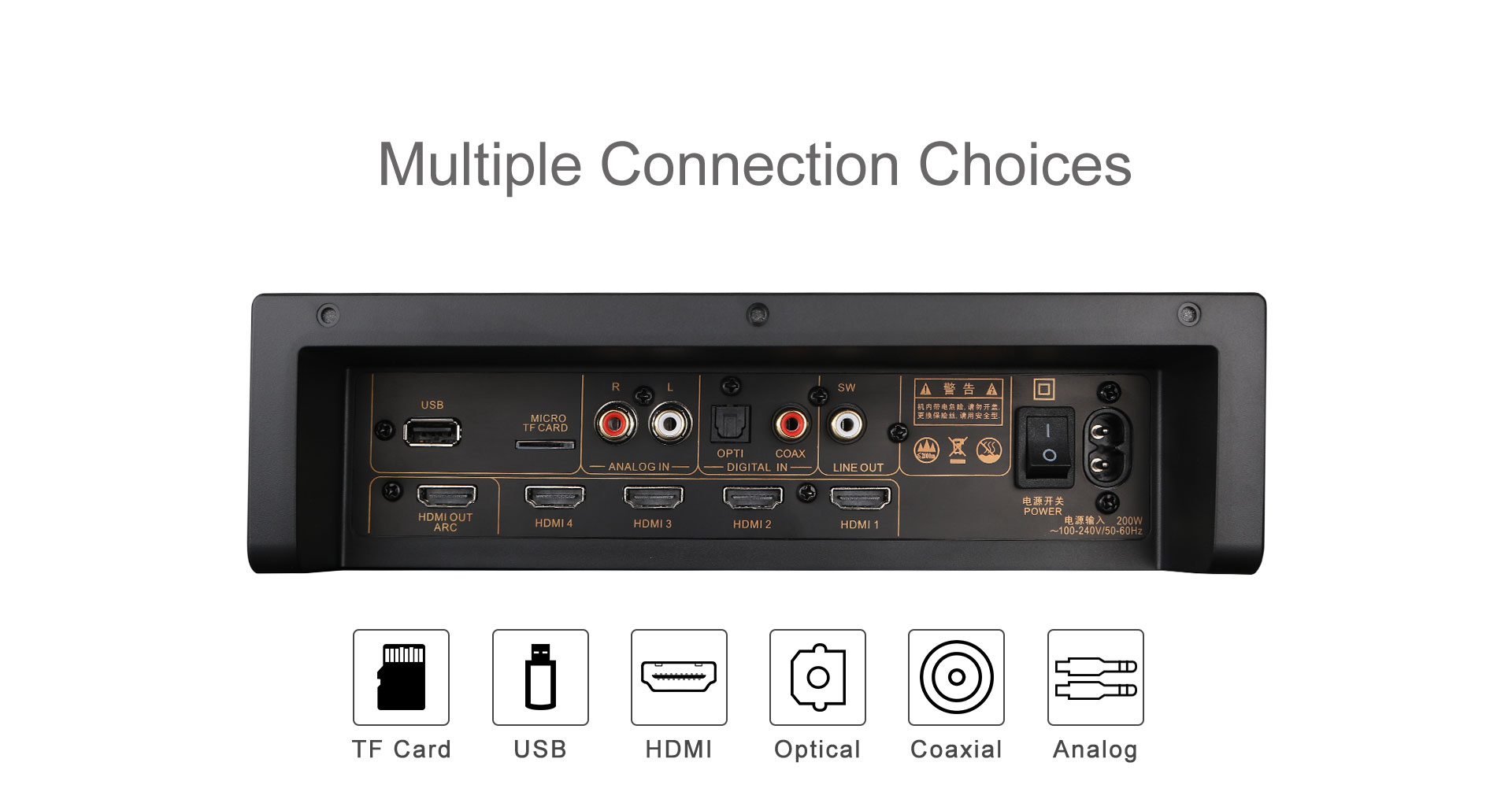 4-drożne HDMI2. 1 , 1-drożny USB, 1-drożny karta TF, 1-drożny optyczny, 1-drożny koncentryczny, 1-drożny analog. |