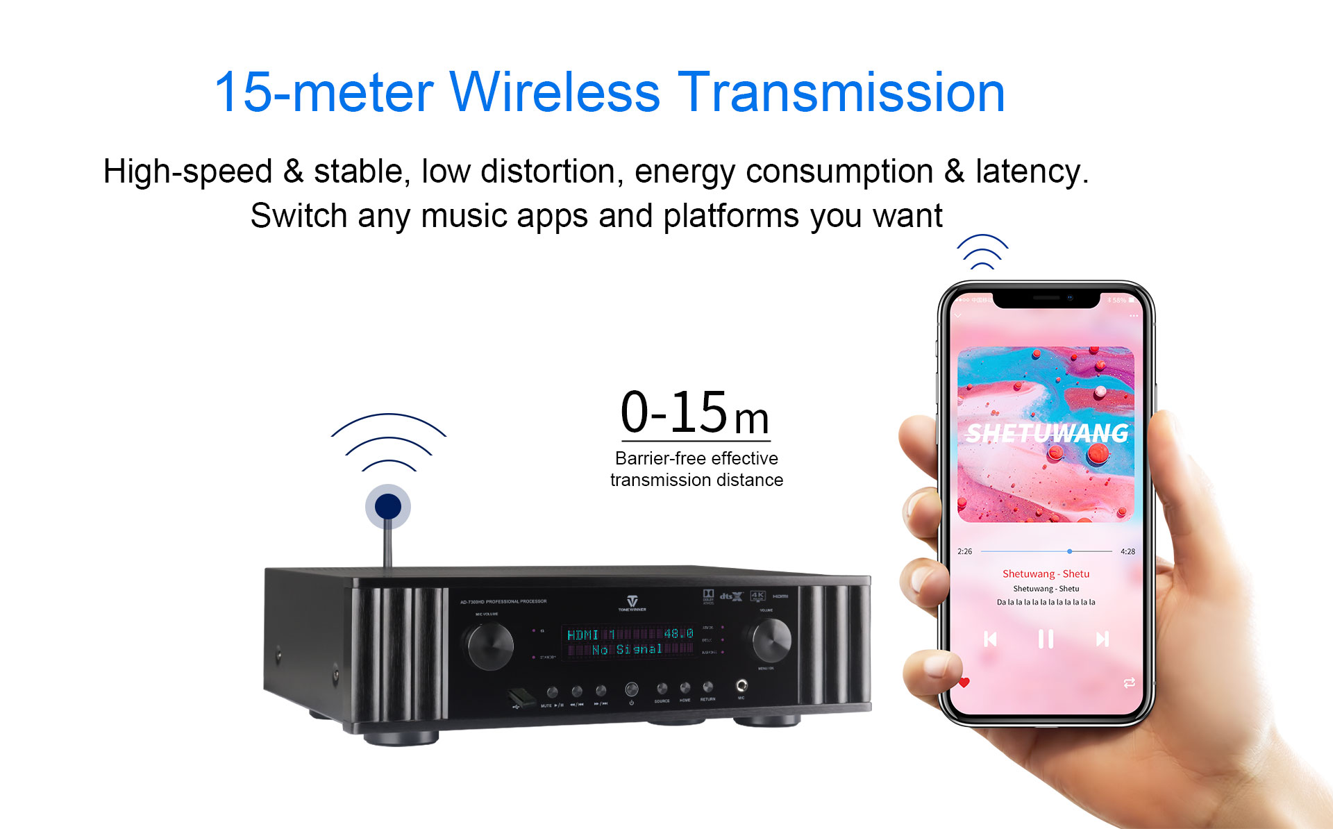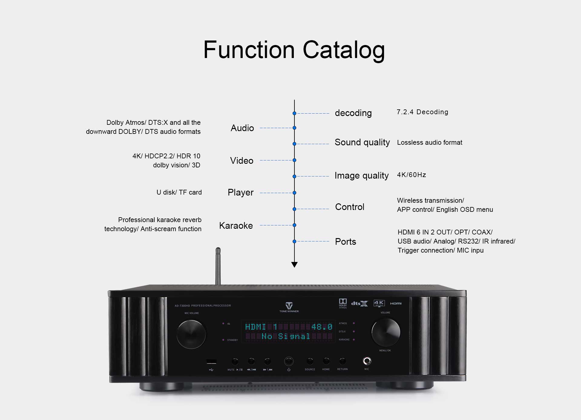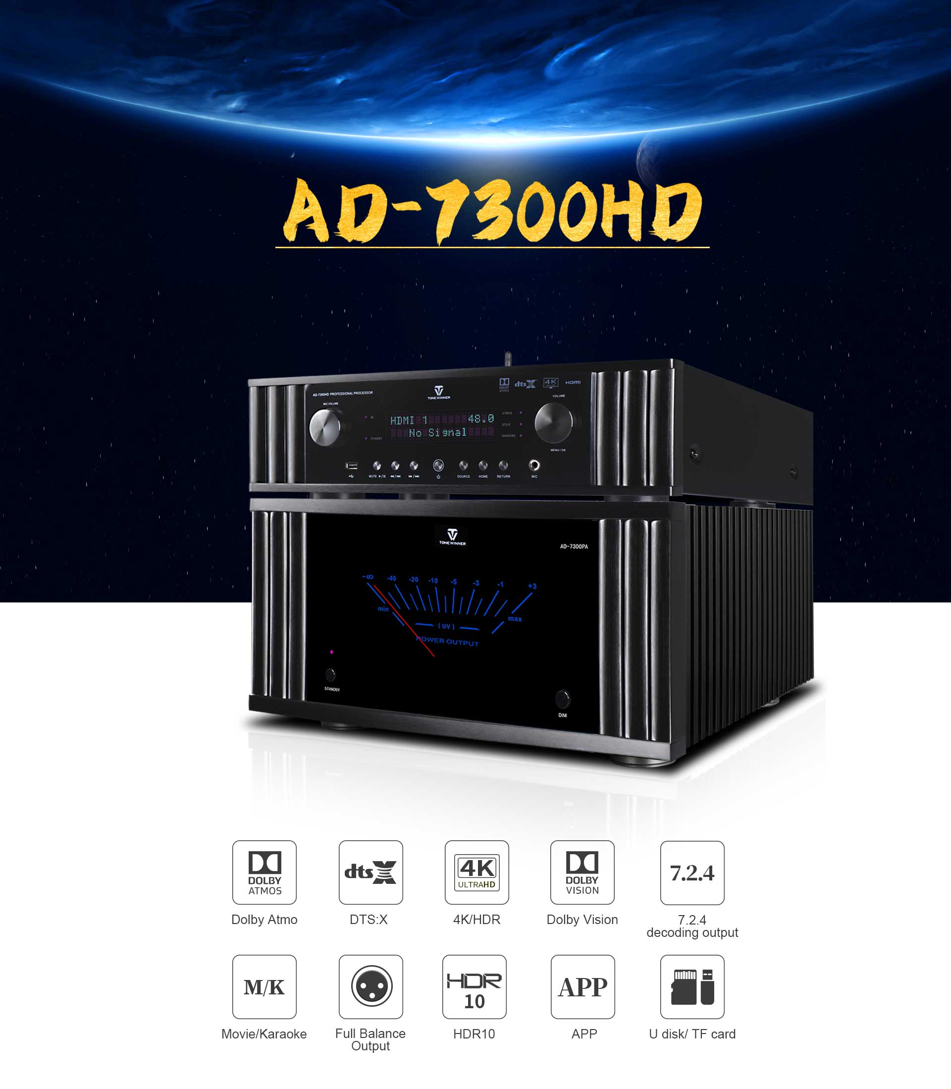 AD-7300HD to zintegrowany procesor audio-wideo do odtwarzania muzyki, kina i karaoke. Obsługuje dekodowanie Dolby Atmos, DTS:X, 4K i jest kompatybilny z technologiami 3D, HDR, Dolby Vision itp. Obsługuje menu warstwowe OSD, podgrupy matryc i automatyczną kalibrację korektora. Obsługuje również sterowanie za pomocą aplikacji, dysk USB i kartę TF. Jako wielofunkcyjny dekoder, doskonale nadaje się do domowej rozrywki z wciągającymi efektami dźwiękowymi.
