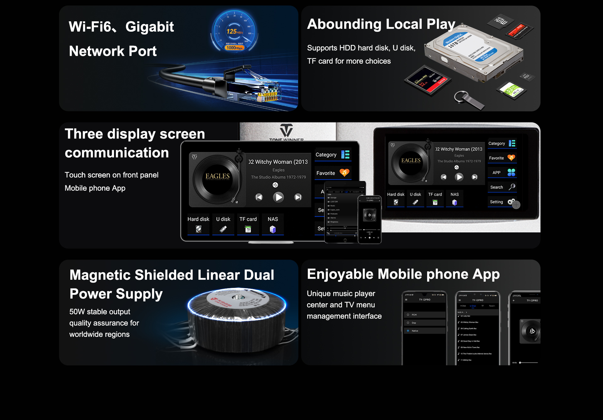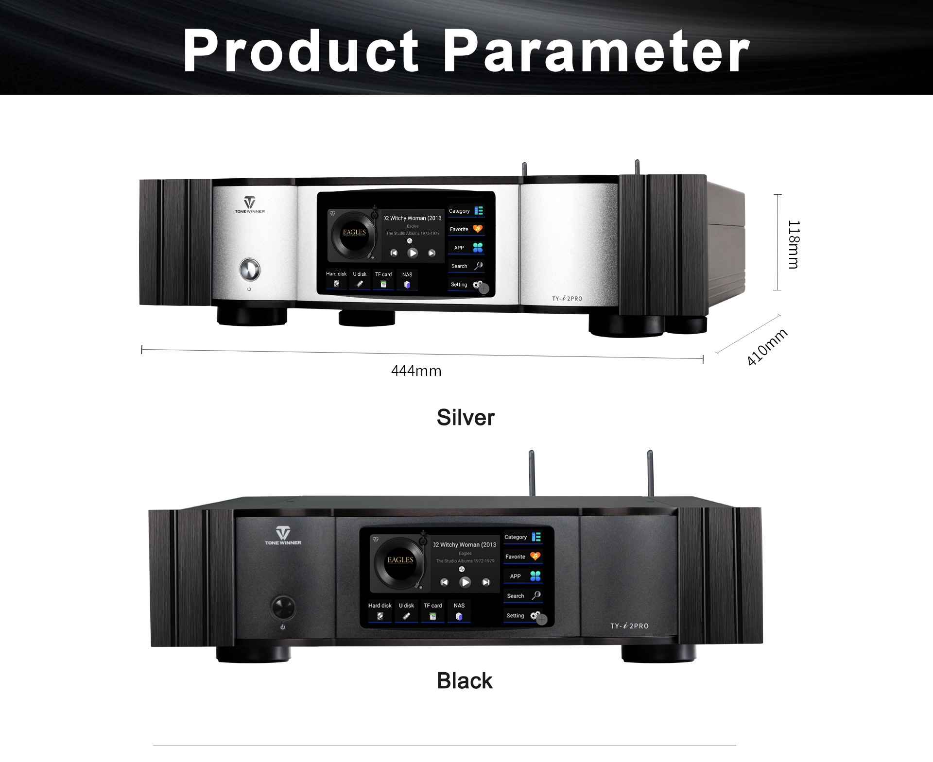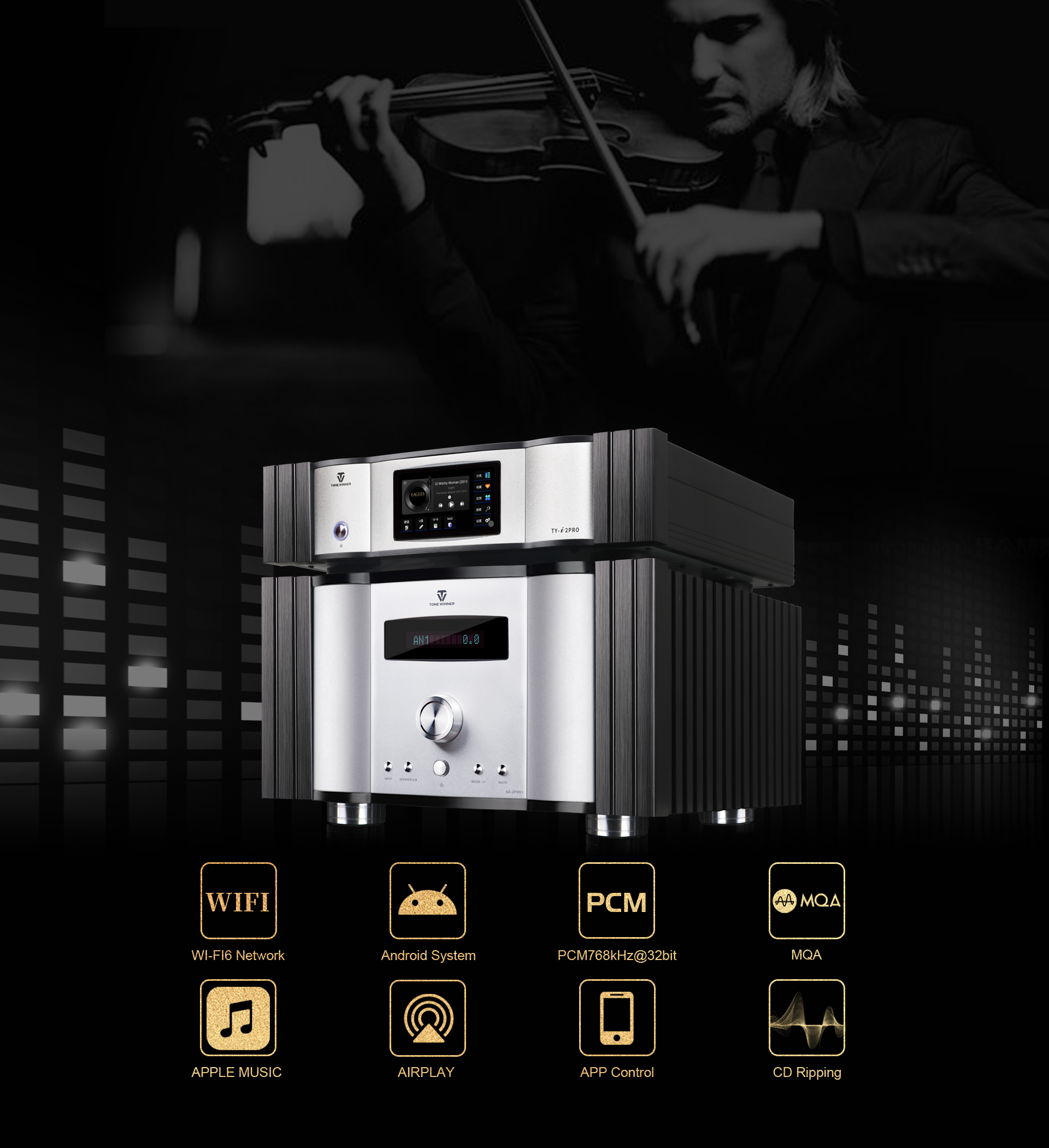 TY-i2PRO to wydajny i wszechstronny odtwarzacz strumieniowy sieciowy. Jest to odtwarzacz audio klasy Hi-Fi klasy High End. Wykorzystuje on autorską technologię Hi-Fi firmy Tonewinner, która umożliwia bezpośrednie wyprowadzanie sygnałów audio. Oznacza to, że na sygnał audio z TY-i2PRO nie wpływa zegar systemowy, a dźwięk z TY-i2PRO zachowuje bezstratną jakość dźwięku Hi-Fi.